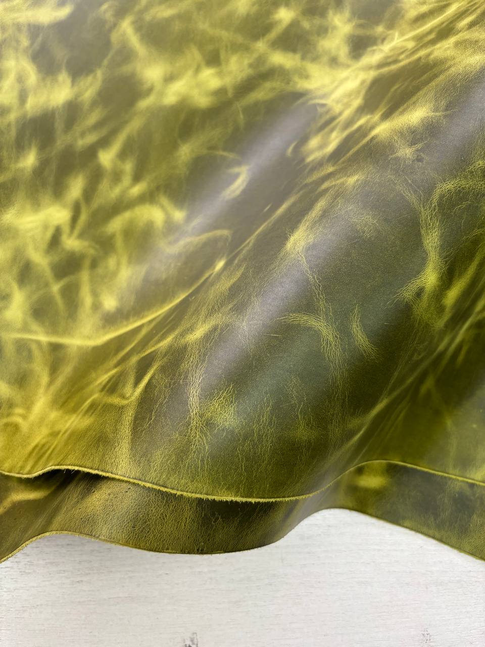 Натуральная кожа, достаточно плотная, с восковой отделкой и ярким эффектом пулл-ап. Кожа плотная, но при этом пластичная, приятная на ощупь. Бахтарма ровная, аккуратная, сквозного прокраса. Кожа не любит длительный контакт с водой, учитывайте это при пошиве изделий. Характеристики: — дубление: хромовое — конфигурация: полукожа — толщина: 1.3–1.5 мм — цвет: лайм Цена: 1.20 бел. руб/дм.