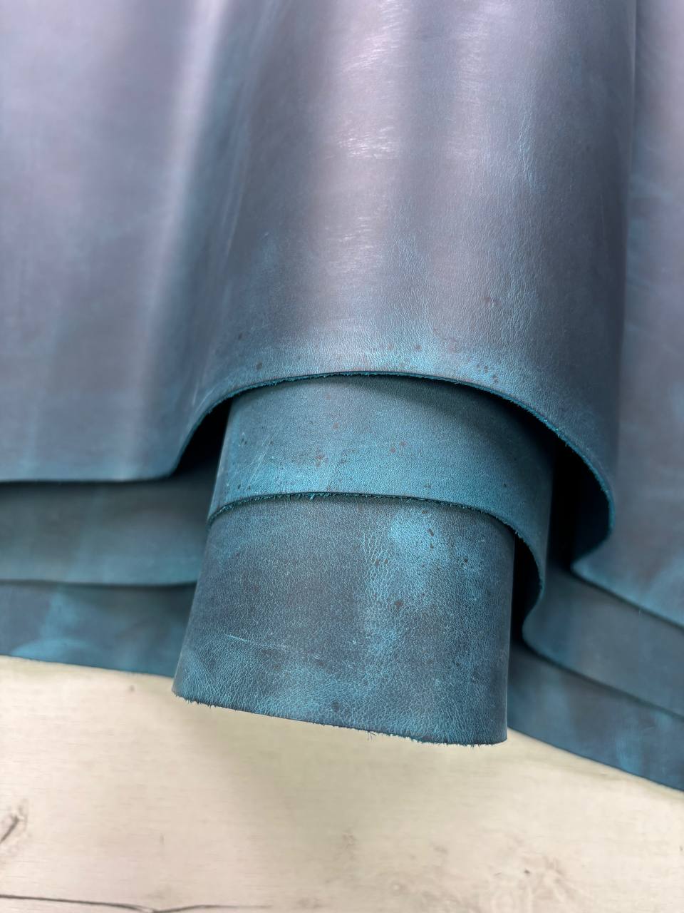 Натуральная кожа, достаточно плотная, с восковой отделкой и ярким эффектом пулл-ап. Кожа плотная, но при этом пластичная, приятная на ощупь. Бахтарма ровная, аккуратная, сквозного прокраса. Кожа не любит длительный контакт с водой, учитывайте это при пошиве изделий. Характеристики: — дубление: хромовое — конфигурация: полукожа — толщина: 1.3–1.5 мм — цвет: морская волна Цена: 1.20 бел. руб/дм.