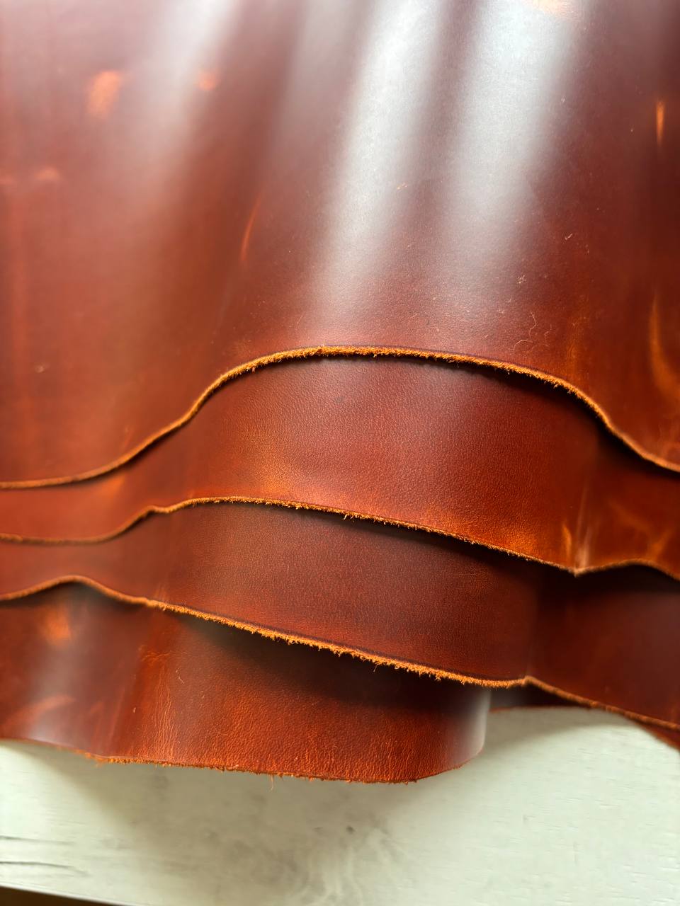 Натуральная кожа, достаточно плотная, с восковой отделкой и ярким эффектом пулл-ап. Кожа плотная, но при этом пластичная, приятная на ощупь. Бахтарма ровная, аккуратная, сквозного прокраса. Кожа не любит длительный контакт с водой, учитывайте это при пошиве изделий. Характеристики: — дубление: хромовое — конфигурация: полукожа — толщина: 1.3–1.5 мм — цвет: оранж Цена: 1.20 бел. руб/дм.