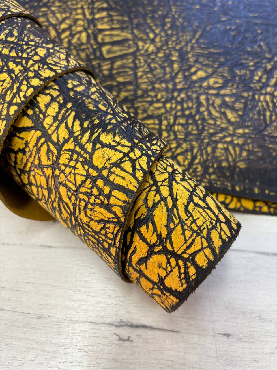 Натуральная кожа с красивой фактурой, достаточно плотная, но без финишного покрытия. Кожа имеет тиснение плитой, не глубокое, тактильно ощущается. Данное тиснение придаёт коже винтажный вид. Бахтарма аккуратная, сквозного прокраса, яркая жёлтая. Подходит для аксессуаров и изделий с винтажной фактурой. Характеристики: — дубление: хромрастительносинтанное — крашение: барабанное — с тиснением плитой Тигина — конфигурация: вороток — толщина: 1.3–1.5 мм — цвет: жёлтый Цена: 0.75 бел. руб/дм.