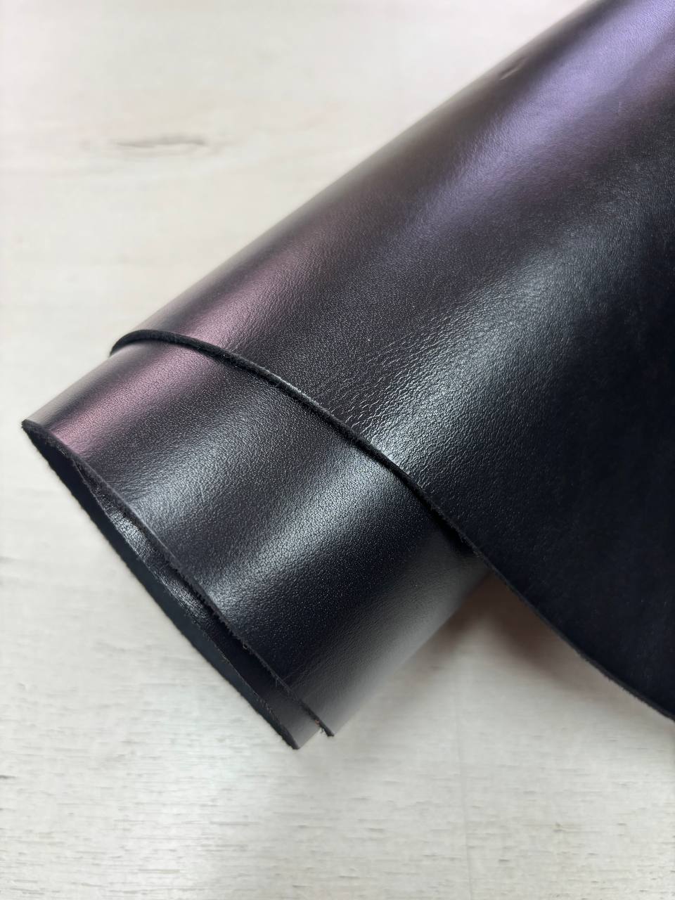 Натуральная кожа с красивым умеренным блеском, достаточно плотная кожа с финишной отделкой и ровной, аккуратной бахтармой сквозного прокраса. Кожа отлично подходит для крупной кожгалантереи, дополнительной отделки не требуется. Характеристики: — дубление: хромрастительносинтанное — крашение: барабанное, с финишной отделкой — конфигурация: полукожа — толщина: 1.8–2.2 мм — цвет: чёрный Цена: 0.85 бел. руб/дм.
