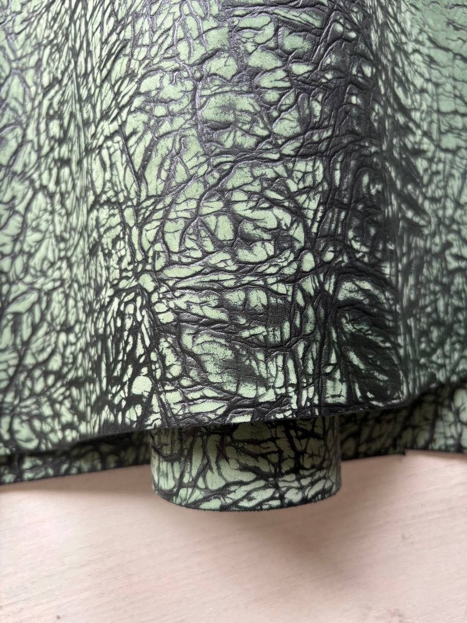 Натуральная, фактурная, достаточно плотная кожа с тиснением и без финиша. Тиснение на коже придаёт винтажный вид. Кожа со шлифованной лицевой поверхностью и красителем. Бахтарма аккуратная, сквозного прокраса. Подойдёт для изготовления крупной кожгалантереи. Характеристики: — дубление: хромрастительносинтанное — крашение: барабанное — без финишной отделки, с тиснением и красителем — конфигурация: полукожа — толщина: 1.8–2.2 мм — цвет: зелёный Цена: 0.85 бел. руб/дм.