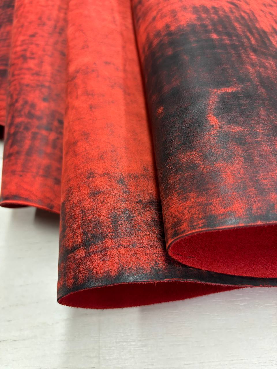 Натуральная кожа винтажного вида с чёрным красителем и шлифовкой. Кожа в местах шлифовки имеет бархатистость, средней плотности, бахтарма красивая, аккуратная. Подходит для изготовления мелкой кожгалантереи, а вариант потолще — для изготовления крупной кожгалантереи. Характеристики: — дубление: хромрастительносинтанное — крашение: барабанное с чёрным красителем и шлифовкой — конфигурация: полукожа — толщина: 1.8–2.2 мм и 1.2–1.4 мм — цвет: красный Цена: 0.85 бел. руб/дм.